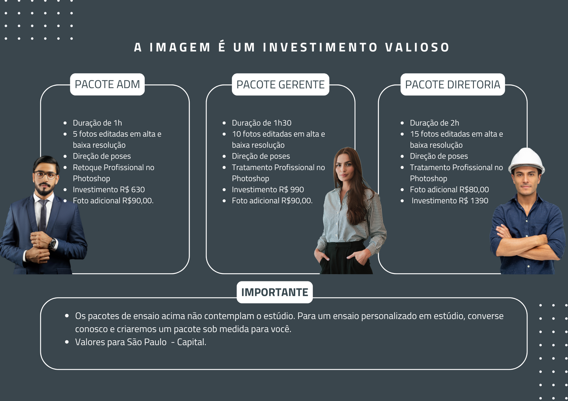 Invista na sua imagem com um serviço de fotografia profissional que oferece excelente custo-benefício.